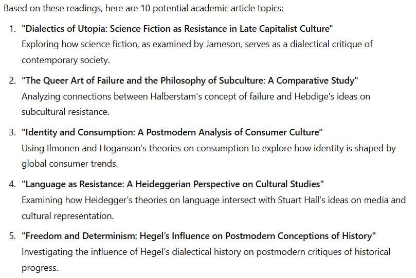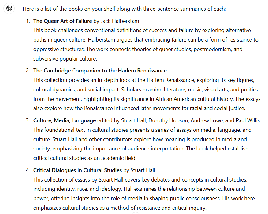 My prompt to ChatGPT was, āHere is a photo of books on my shelf. I've read all of these. provide a list of titles, followed by a three sentence summary of each. then suggest 10 potential academic articles I could write based on these sources.ā (Also, for context, I should mention that Iād recently reminded it that Iām an English professor.) The bot pretty much nailed it from a photograph. Here are the first four: