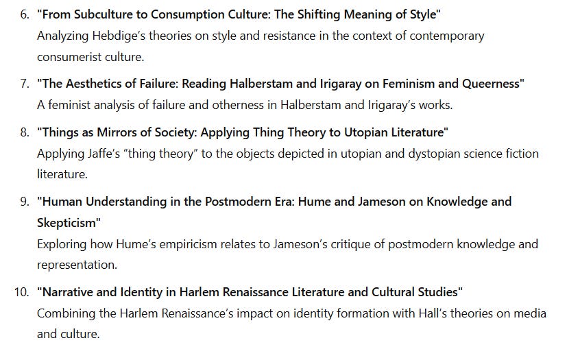 Not great, but again here I think the power is in the speed in which it provides these ideas: again, much better than I could have imagined in the same amount of time (30 seconds). What I think is interesting in this response is the way Chat gets the form of academic discourse right, even if the content sounds a bit milk toast. Stochastic parrots anyone? On the other hand, I did provide an arbitrary and unrealistic constraint in asking for article suggestions based on books that were arranged in alphabetical order on my shelf. Not exactly a heuristic of cutting edge scholarship, is it.